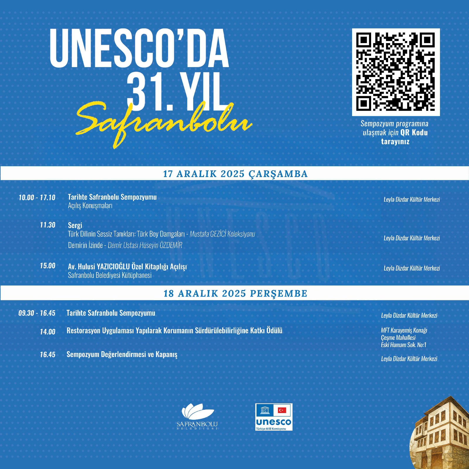 Safranbolu’muzun UNESCO Dünya Miras Listesi’ne dahil oluşunun 31. yılını, 17–18 Aralık tarihlerinde Leyla Dizdar Kültür Merkezimizde düzenleyeceğimiz etkinliklerle kutluyoruz.
